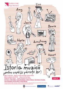 „Istoria muzicii pentru copii (si parintii lor)” este un spectacol distractiv si educativ, pentru intreaga familie, care isi propune sa poarte publicul intr-o calatorie muzicala incepand de la Mozart pana la David Bowie sau Amy Winehouse. Actorii, marionetele si muzica live recreeaza cu umor fiecare perioada si amintesc de felul in care muzica, indiferent de perioada ei, este un lucru care ne aduce impreuna.